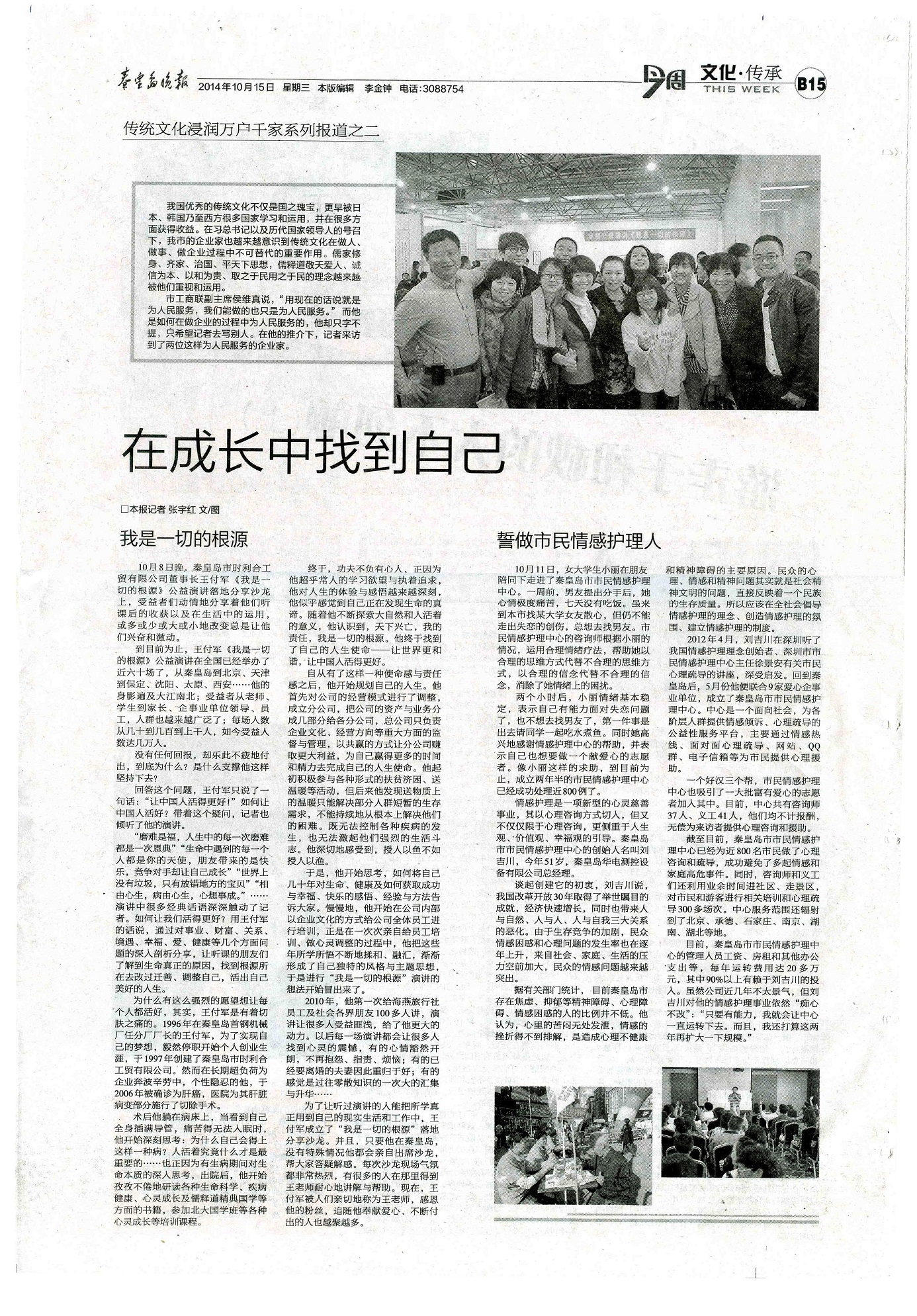 于是,他開始思考,如何將自己幾十年對生命、健康及如何獲取成功與幸福、快樂的感悟、經(jīng)驗與方法告訴大家。慢慢地,他開始在公司內(nèi)部以企業(yè)文化的方式給公司全體員工進行培訓,正是在一次次親自給員工培訓、做心靈調(diào)整的過程中,他把這些年所學所悟不斷地揉和、融匯,漸漸形成了自己獨特的風格與主題思想,于是進行“我是一切的根源”演講的想法開始冒出來了。